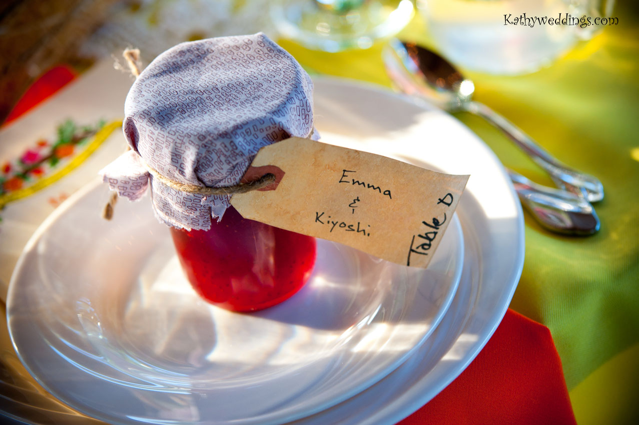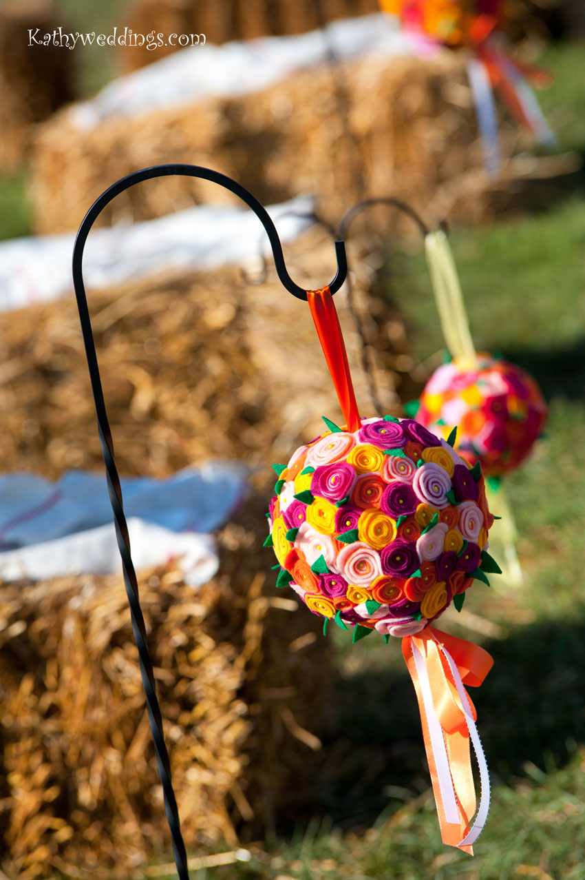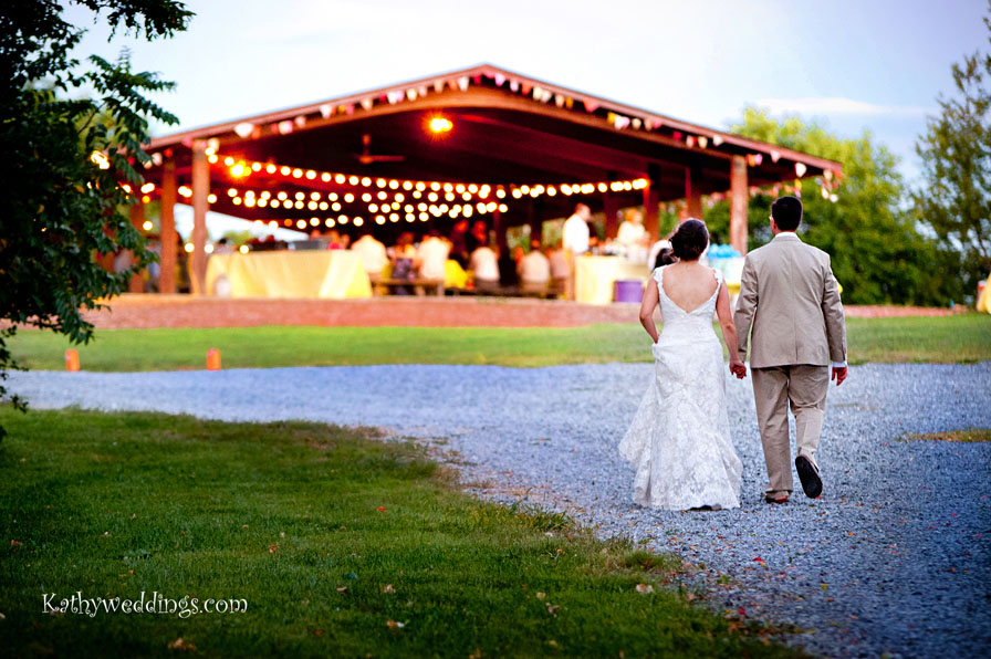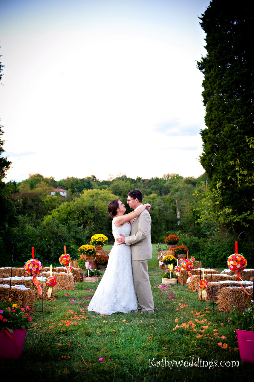 When Missy and I pulled up to High Point Farm in Clarksburg, MD we weren’t sure if this simple park and pavillion setting was the correct address – then we found Julie Savage from Strawberry Milk Events setting up the ceremony in a field, with hay bales for seating and we knew we were in the right place. Claire and Julie had both described the vision of the wedding day and we knew it was going to be really cool – but we were blown away with all the vibrant details that Claire & Adam had created. Their ceremony was touching and personal, with an eclectic edge. They had all their guest stand up during the ceremony and Claire’s sister in law led an interpretive dance to “All you need is Love” by the Beatles. Then after the ceremony we walked over to the pavillion that they had turned into a country fair themed wonderland. They had fresh squeezed lemonade, and someone squeezing it right in front of you! They had a whole field filled with lawn games like croquet and horseshoes. We brought along our photobooth – so people could take silly pictures of themselves with props like hats and masks. Instead of a traditonal cake cutting, they had a pie table of amazingly delicious homemade pies and cut one. They had pit barbeque and also a popcorn machine. Then at the end of the night guests talked and sat around a bonfire that was lit out on the lawn. It was an amazing event that I will never forget – I’m sure that all their guest won’t forget it either! I loved all the personal touches that Claire and Adam put on their version of what a wedding should be.